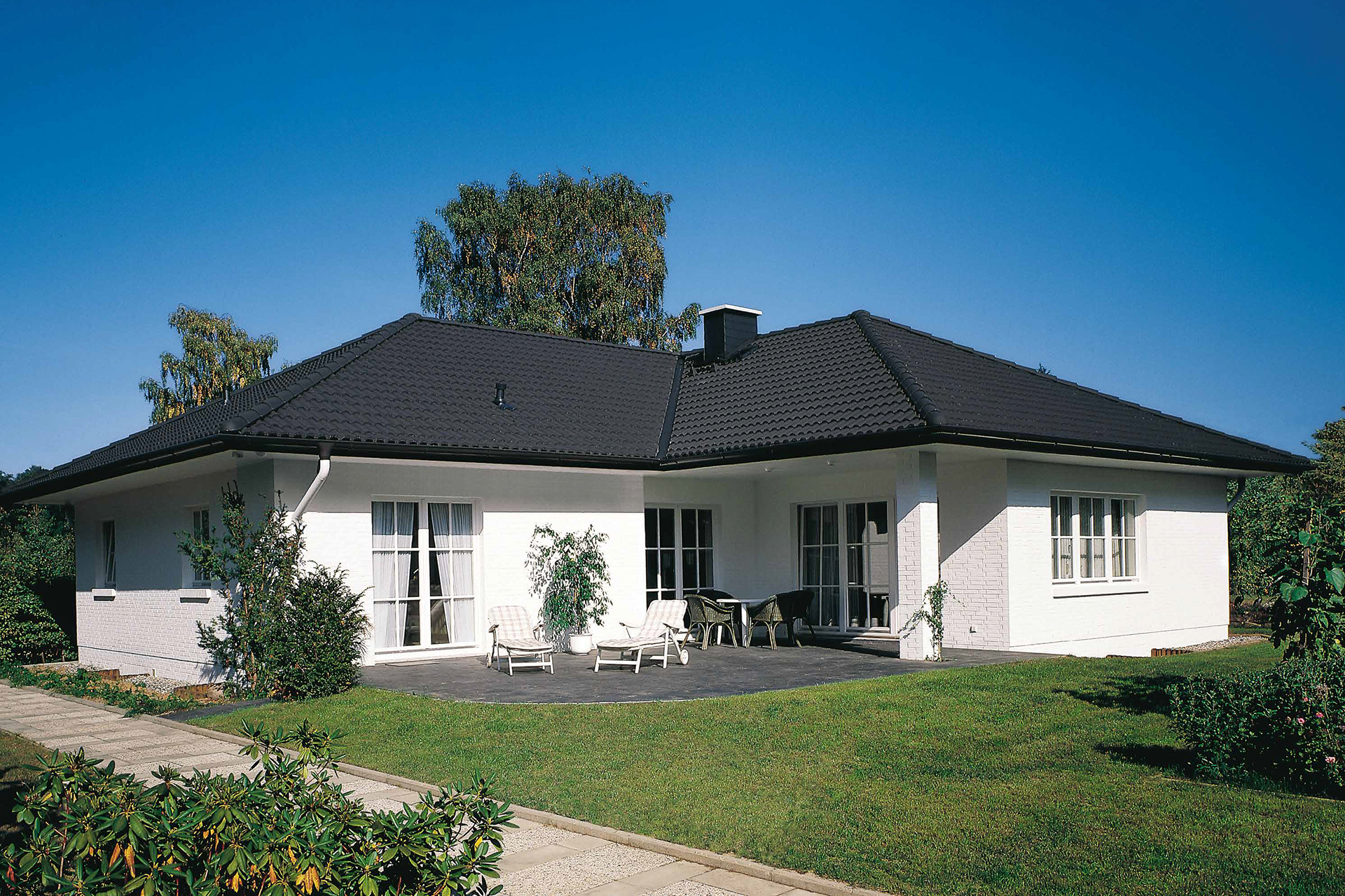 Klassischer Winkelbungalow mit elegantem Walmdach; überdachte Terrasse, individuell gestalteter Wohn- und Essbereich.